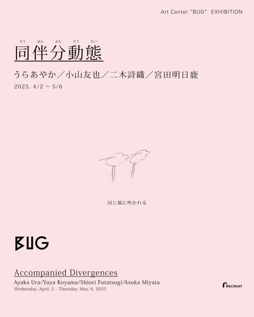 東京のアートセンター・BUGで2025年4-5月に開催された、うらあやか、小山友也、二木詩織、宮田明日鹿の4名のアーティストによる実験的な展覧会「同伴分動態」の展覧会書籍。