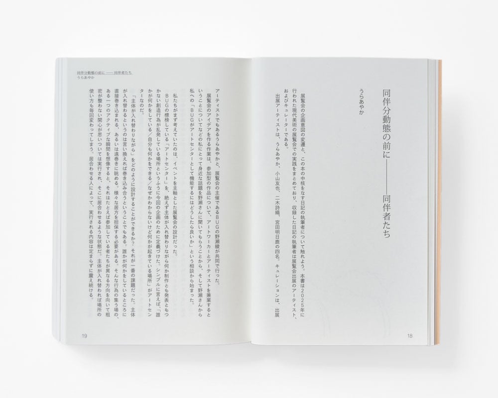 Published in conjunction with an experimental exhibition by four artists, held in 2025 at BUG, an art center in Tokyo operated by Recruit Holdings Co., Ltd., this volume brings together not only artwork texts and a critical essay on the exhibition, but also an extensive record of the project as a whole. The book includes documentation of events and workshops, conversations, artists’ diaries and essays, as well as Yuya Koyama’s project, “Interviews from the Field of Alternative Art Education.”